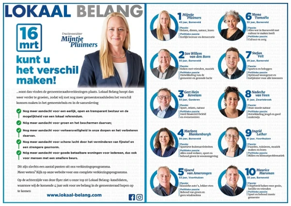 Vol trots presenteert Lokaal Belang haar kieslijst met 50 kandidaten. Lokaal Belang groeide en bloeide de afgelopen jaren. En daar zijn wij trots op. Van al die Lokale Belangers hebben de leden maar liefst 50 kandidaten geselecteerd voor de kieslijst. De leden stelden deze onlangs per acclamatie vast. Een lijst die zich kenmerkt door stabiliteit, continuïteit en plaats voor nieuw talent. Lokaal Belang gaat met deze kieslijst vol optimisme de gemeenteraadsverkiezingen in. Lokaal Belang is verder trots op goede verhouding man-vrouw; in de top 10 zelfs 50-50%.