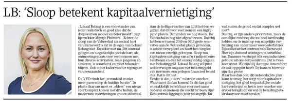 Dat gaan wij de komende tijd ook doen in álle andere dorpen met diverse thema’s die er in het dagelijks leven van mensen toe doen. Daarvoor zitten wij in de raad; opkomen voor hun belang. En, zoals iedereen dat van Lokaal Belang gewend is, gaan wij serieus om met deze belangrijke thema’s die spelen en van grote invloed zijn op de leefbaarheid van onze inwoners. Zo hebben wij ons onlangs als enige partij in de gemeenteraad ingezet voor het behoud van het Pastoriebos in Voorthuizen en zien wij dat er geen draagvlak is voor de komst van mega-windmolens op Harselaar, vlakbij Zeumeren. Daarnaast is behoud van groen ontzettend belangrijk en willen wij via een lokaal referendum onze inwoners echt een stem geven.
