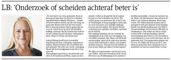 Lokaal Belang, SGP en CU dienden een motie in om de plaatsing van een (mono)mestvergister in Barneveld te onderzoeken. Dit voorstel haalde het, zodat er in de toekomst wellicht groen gas uit Barneveldse mest kan worden gewonnen. Ondanks een hartstochtelijk pleidooi van de fractievoorzitters van Lokaal Belang, Pro98 en CU zat een verbod op houtstook ten tijde van een negatief stookadvies er niet in. Wat wel lukte was een motie om met Voorthuizen te gaan overleggen om daar een skatebaan te plaatsen. Op initiatief van Lokaal Belang en met medepleitbezorgers CU, CDA en Pro98 wist dit voorstel een ruime meerderheid te halen.
