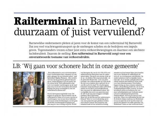 Lokaal Belang staat voor een goed ondernemersklimaat. Echter, de economie van onze gemeente is al goed en sterk en kan prima zonder een railterminal die meer nadelen dan voordelen gaat opleveren. Overvolle wegen zijn slecht voor de verkeersveiligheid en bereikbaarheid van onze inwoners en ondernemers. Nog meer vrachtwagens betekent overigens ook nog meer fijnstof en stikstof in de lucht die al niet al te best is. Kortom, een belangrijk thema waar Lokaal Belang de aandacht voor vraagt.
