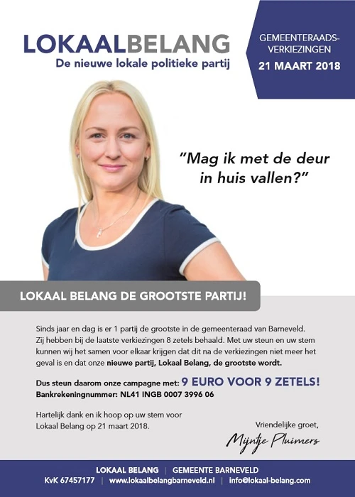 Lijsttrekker Mijntje Pluimers: “Lokaal Belang is een nieuwe politieke partij. En als nieuwe partij hebben wij de ambitie om met een prachtig lokaal verkiezingsprogramma straks de grootste partij van onze gemeente te worden. Bij de laatste verkiezingen heeft de grootste partij 8 zetels gehaald. Dat betekent dat wij in maart 2018 tenminste 9 zetels willen halen. En omdat er geld nodig is om een campagne te voeren, vragen wij iedere inwoner van de gemeente Barneveld ons te ondersteunen, door een euro te doneren voor iedere zetel die wij willen veroveren; dus 9 euro voor 9 zetels. Iedere euro die wij ontvangen wordt enkel en alleen voor de campagne gebruikt.