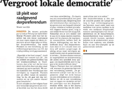 Lokaal Belang komt op voor de democratische rechten van burgers van onze gemeente. Wij willen niet meewerken aan het overhevelen van bevoegdheden van deze gemeente en dus van haar burgers, naar samenwerkingsverbanden waarop burgers (bijna) geen invloed hebben. En wij zetten ons in voor een goede, open en eerlijke communicatie tussen de gemeentelijke overheid en haar burgers en de mogelijkheden van inspraak”.