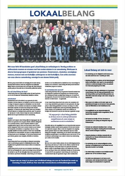 Om al deze ambities waar te maken zoekt Lokaal Belang enthousiaste en betrokken medestanders. Iedereen die mee wil werken, mee wil denken en mee wil doen, op welke manier dan ook, is van harte welkom! Wij gaan graag het gesprek met u aan. U kunt zich aanmelden via de website op de pagina 'ik doe mee'.