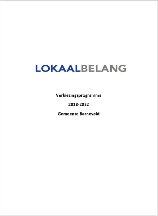 Voor u ligt het verkiezingsprogramma van de nieuwe lokale, zelfstandige en onafhankelijke politieke partij in de gemeente Barneveld; Lokaal Belang. Dit verkiezingsprogramma is het resultaat van twee jaar intensieve samenwerking van het team. Daarnaast hebben vele betrokkenen die Lokaal Belang een warm hart toedragen, input en commentaar geleverd. Daar ben ik erg dankbaar voor.