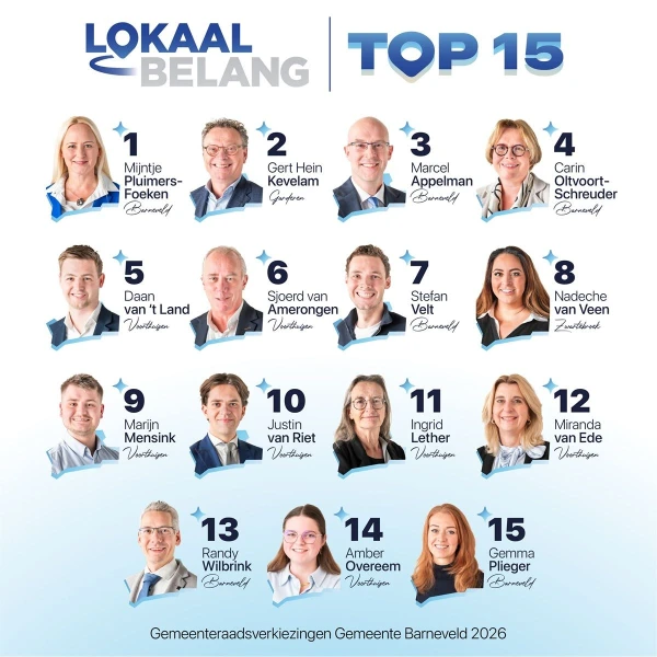 De top 15 is een sterke en gevarieerde lijst. Zoals eerder bekend voert Mijntje Pluimers-Foeken (48, Barneveld), huidig wethouder namens Lokaal Belang, de lijst aan. Gevolgd door plek 2 voor Gert Hein Kevelam, de huidige fractievoorzitter (57, Garderen). Huidig raadscommissielid en tevens energiek campagneleider Marcel Appelman (46, Barneveld) staat op plek 3. De 4e plek is voor de hoogste nieuwe binnenkomer; een krachtig nieuw talent; jurist Carin Oltvoort-Schreuder (51, Barneveld). Op plek 5 de hoogste jongere; gedreven talent en raadscommissielid, Daan van ’t Land (24, Voorthuizen). Op respectievelijk plek 6, 7 en 8, de ervaren en gedegen raadsleden Sjoerd van Amerongen (57, Voorthuizen), Stefan Velt (32, Barneveld) en Nadeche van Veen (34, Zwartebroek). Nieuw en jong talent staat ook op plek 9 en 10; Marijn Mensink (25) en Justin van Riet (24) beiden uit Voorthuizen. Zij hebben er heel veel zin in zich voor de samenleving in te zetten. Huidig raadslid Ingrid Lether (64, Voorthuizen) is opnieuw bereid zich voor Lokaal Belang in te zetten, maar wil dat in een iets andere rol doen. Op plek 12 de actieve Voorthuizense Miranda van Ede (54), plek 13 voor huidig bestuurslid Randy Wilbrink (46, Barneveld). Het jongste talent staat op plek 14; de nu nog 17-jarige Amber Overeem uit Voorthuizen die zich met overtuiging wil inzetten voor een betere samenleving. Op plek 15 de betrokken Gemma Plieger (42, Barneveld).