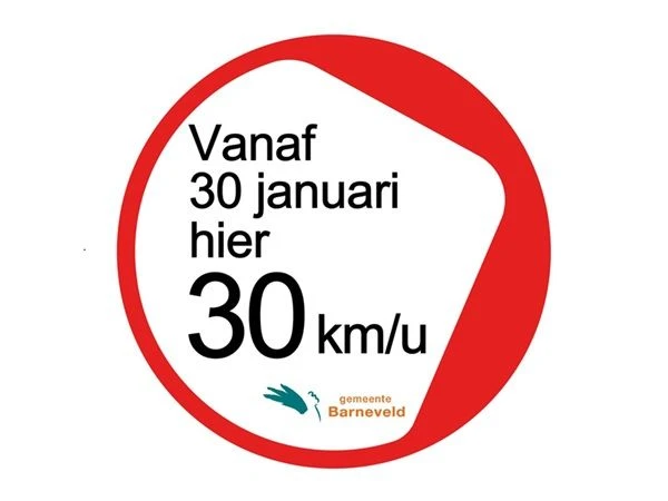 Lokaal Belang heeft kennisgenomen van het gebruik van tijdelijke bebording door de gemeente Amersfoort (1). Daar is per 30 januari op een flink aantal wegen de maximum snelheid teruggebracht van 50 naar 30 km per uur. Vooruitlopend op deze wijziging heeft men de nieuwe 30 km borden al laten plaatsen met een tijdelijke bestickering met daarop de datum per wanneer de wijziging geëffectueerd gaat worden. Alles in het kader van bewustwording en communicatie over een op handen zijnde aanpassing. Als voorbeeld een door ons ontworpen sticker met ons gemeente logo erop (met een fictieve datum).