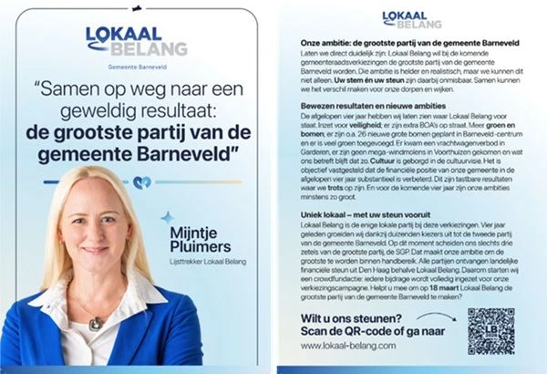 In tegenstelling tot landelijke partijen ontvangen lokale partijen in Nederland geen subsidie uit Den Haag. Dus ook Lokaal Belang niet. Daarom start Lokaal Belang deze week een crowdfundactie via een flyer die deze week in de brievenbus valt. Inwoners die Lokaal Belang willen steunen, kunnen een bijdrage leveren via een link die op deze flyer staat of via de link op onze website. Iedere euro die binnenkomt zal besteed worden aan onze campagne via advertenties in de Barneveldse Krant of andere kanalen die veel geld kosten”.