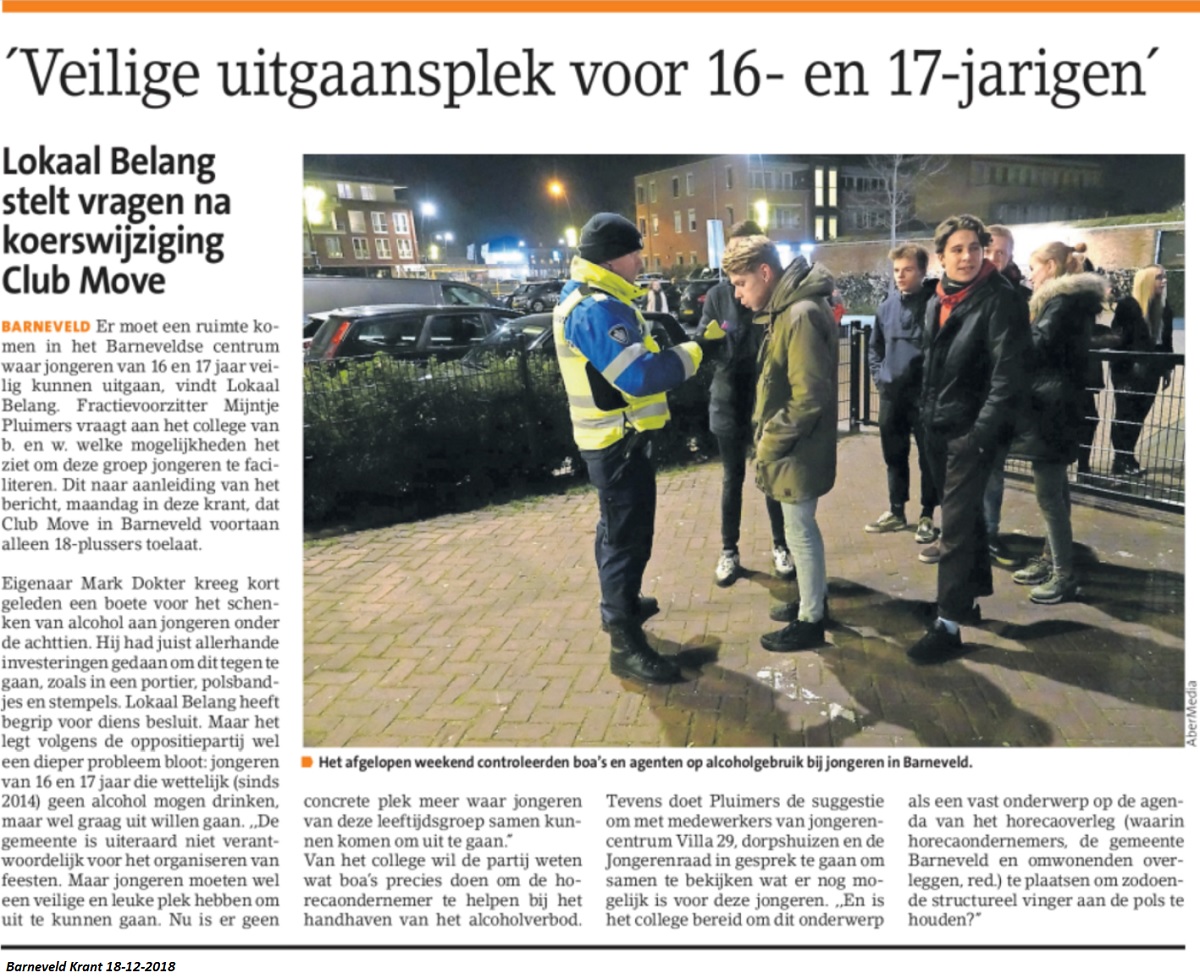 Onze fractie heeft kennisgenomen van het artikel in de krant ‘Club Move Barneveld voortaan alleen voor 18+’. Daarin wordt aangegeven dat de uitbater van de club 16- en 17-jarigen vanaf heden niet meer toelaat.