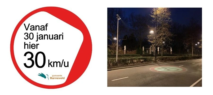 Wellicht is er een mogelijkheid de eerder toegepaste “Zet je licht aan” projector/lamp (2) met een kleine aanpassing in te zetten. Te denken valt hierbij dan aan aanpassing van het beeld van “Zet je licht aan” naar “vanaf nu hier 30” geprojecteerd op het wegdek. In Tilburg heeft de gemeente dat op de Cityring toegepast, zij het met een aparte ledverlichting (3). Het meest effectief is dat dit gaat branden als men (te hard) aan komt rijden natuurlijk.
